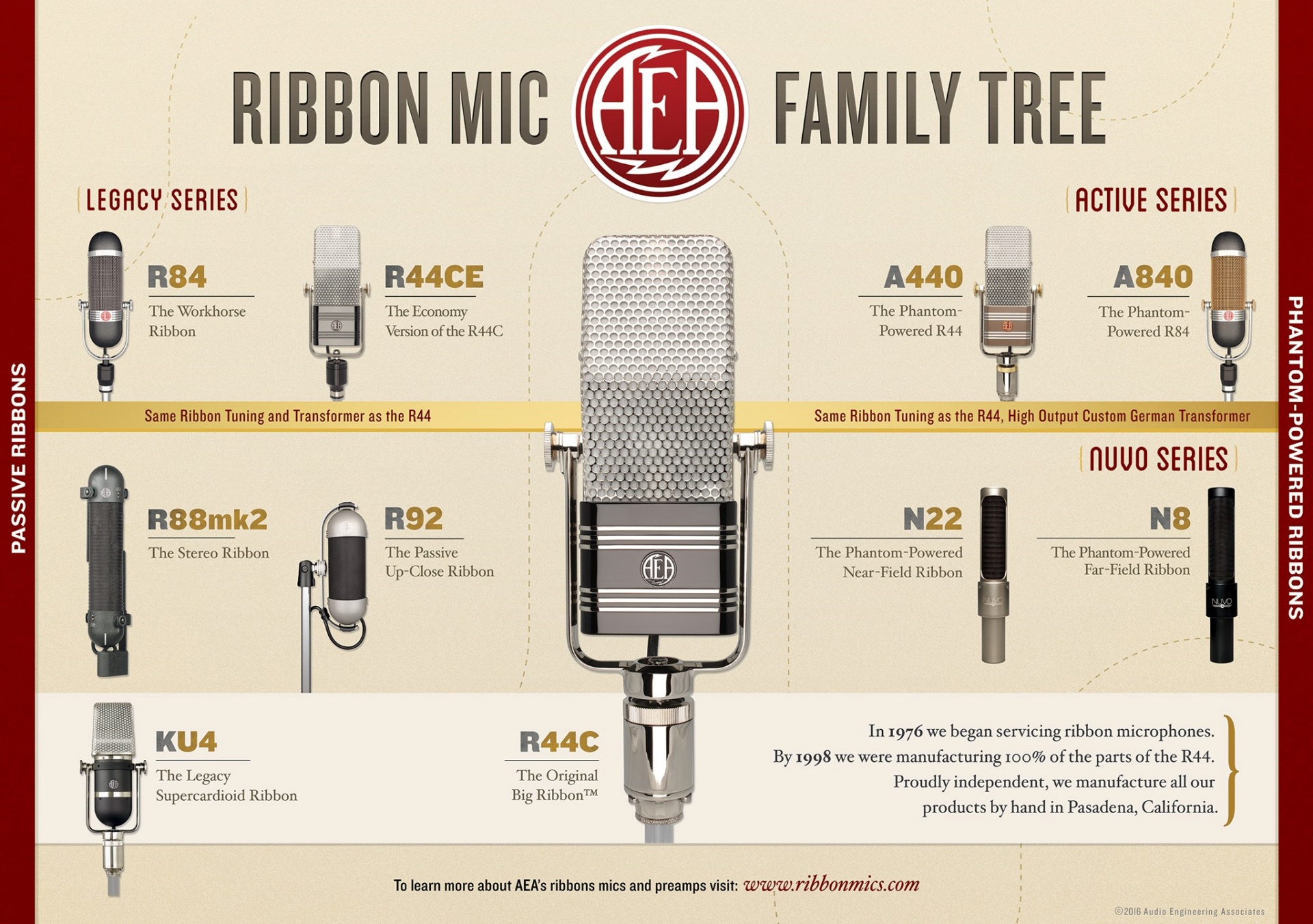 AEA has been producing the parts for and repairing the original RCA 44 and Coles microphones since 1976. Though not a manufacturer then, we ensured the iconic mics of the past stayed in working order and were an essential addition to every professional mic locker.