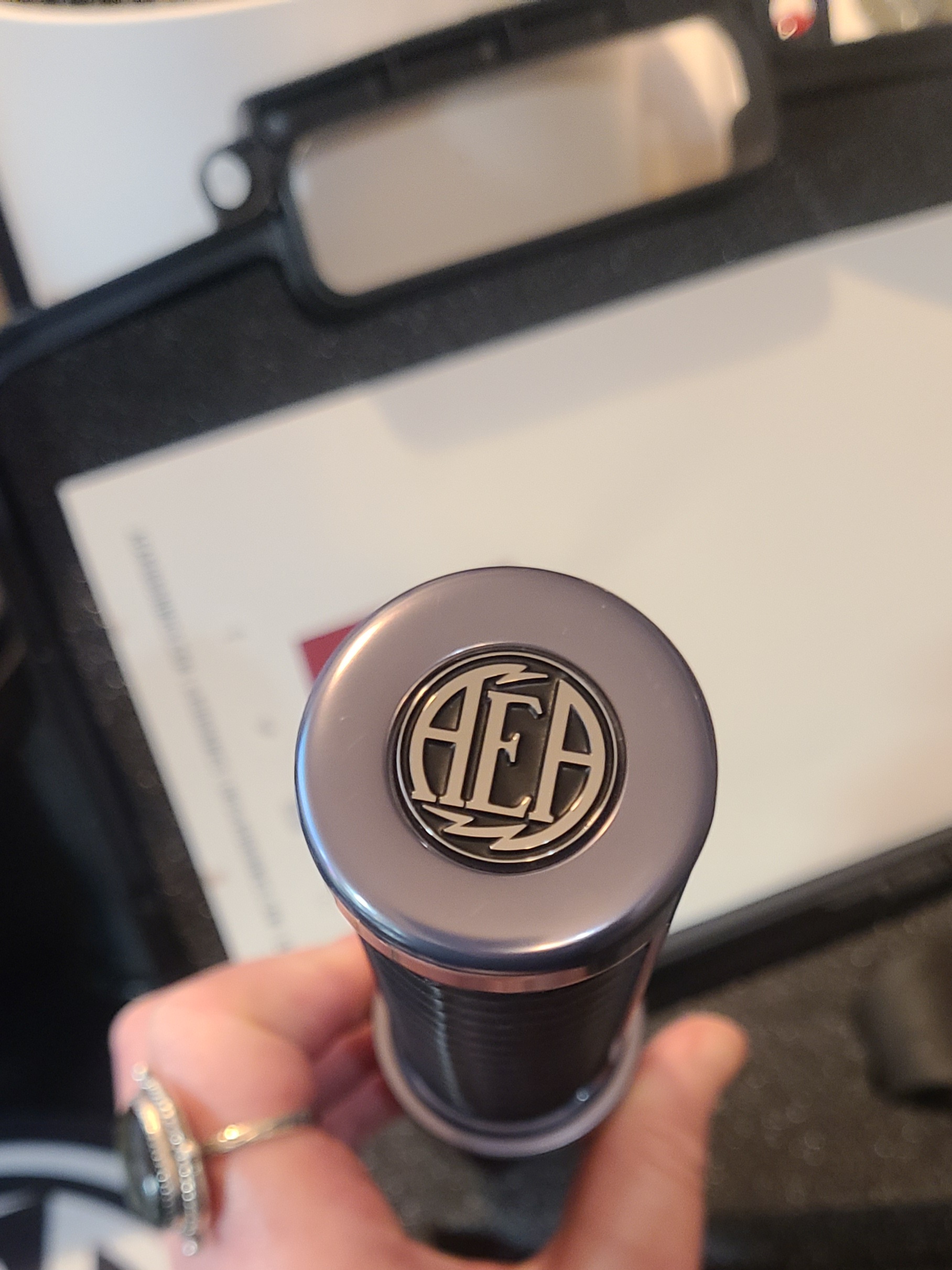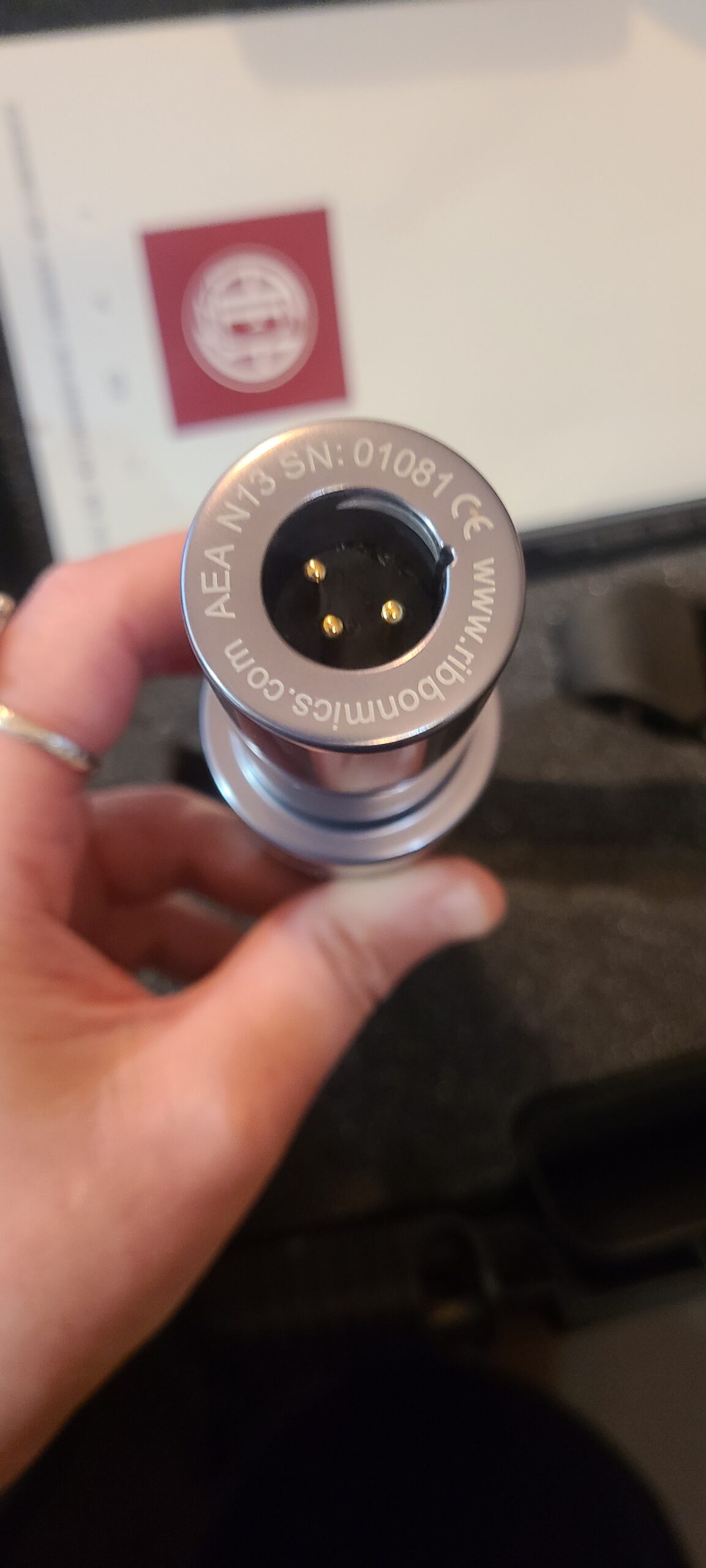 Former demo unit, clean, strip of discoloration from tape around bottom front of the base. Comes with black AEA case, shock mount, mic bag and manual. One year warranty on all B-stock mics with registration within 90 days of purchase. **PLEASE NOTE ALL B-STOCK ITEMS WILL ONLY SHIP DOMESTICALLY, WITHIN THE 50 US STATES**