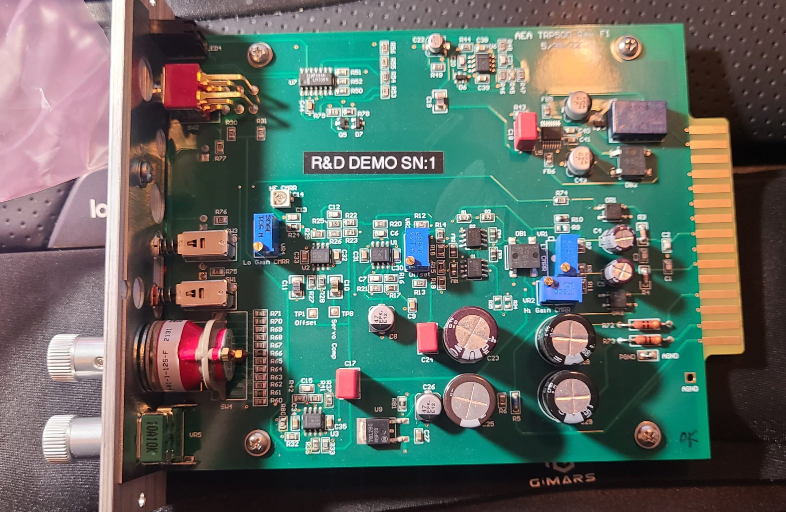 This TRP500 is an R&D unit that was made to compare the subjective quality of various JFETs. As you can see, this TRP500 features LSK389s, which were used on all Gen 2 AEA Preamps. We have since switched to a different JFET for our front end. But for this limited time, you can buy this unit and conduct a pure comparison yourself, as the circuit and op-amps are that of the Gen 3 preamp line. This unit can be safely considered Gen 2.6. These units have a raw aluminum front plate due to my impatience with the long anodization lead time.