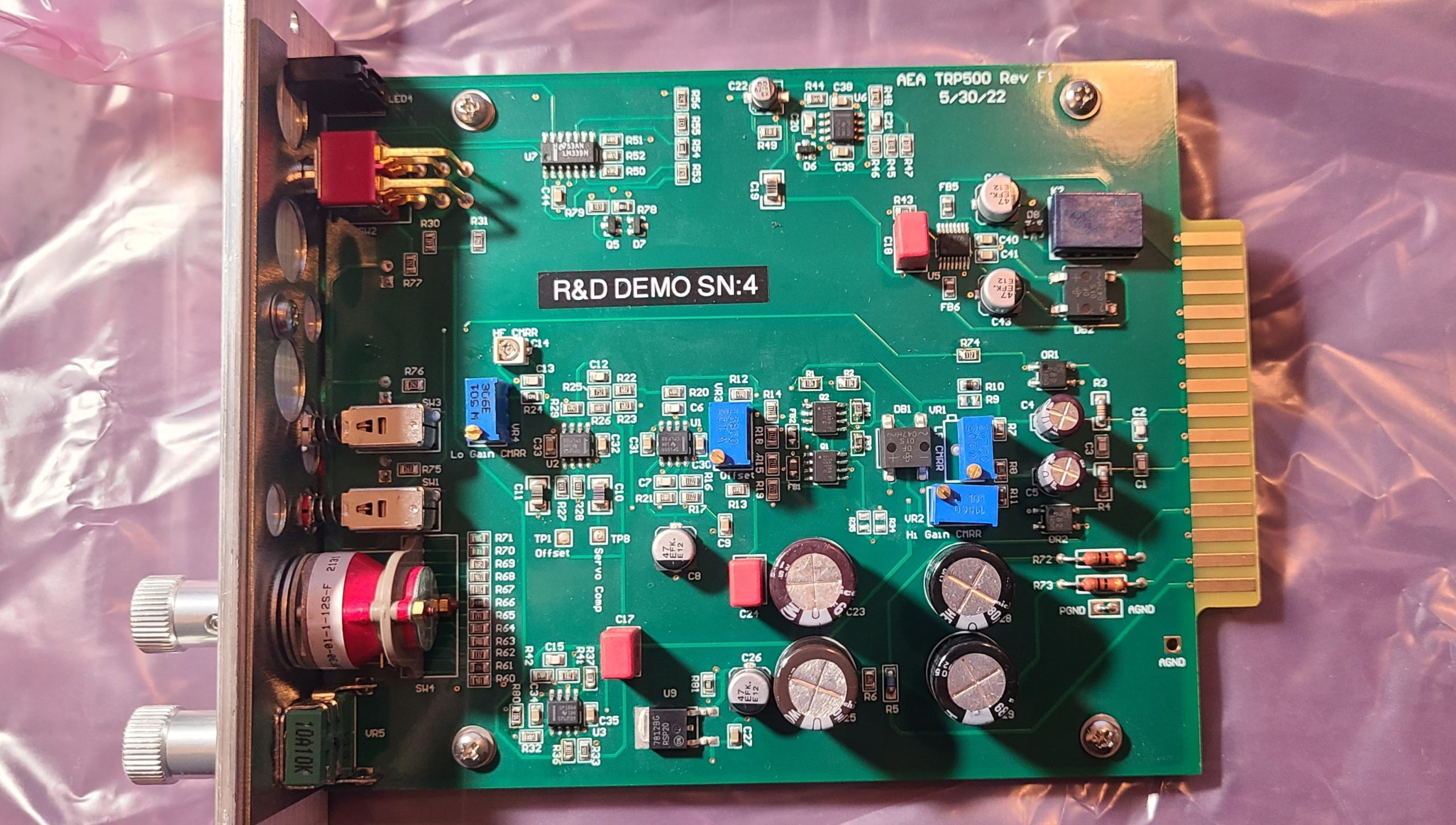This TRP500 is an R&D unit that was made to compare the subjective quality of various JFETs. As you can see, this TRP500 features LSK389s, which were used on all Gen 2 AEA Preamps. We have since switched to a different JFET for our front end. But for this limited time, you can buy this unit and conduct a pure comparison yourself, as the circuit and op-amps are that of the Gen 3 preamp line. This unit can be safely considered Gen 2.6. These units have a raw aluminum front plate due to my impatience with the long anodization lead time.
