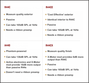 We make several versions of the R44C. Two passive models, The R44C and R44CE differ only from the details of the outer case. Both mics sound the same. A hotrod adds an extra +6dB of output to either passive mic. This is called the ‘X’ transducer mod and it was designed for scoring and other applications demanding a wide dynamic range with the “classic 44” sound.
