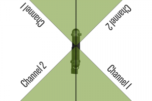 The diagram below details the ‘areas of acceptance’ of the two ribbon elements within the R88. The areas shaded green define the R88’s areas of acceptance. When recording ensembles, ensure the musicians are positioned within these regions. When both channels of the R88 are hard-panned left and right respectively, the stereo image will reflect the positions of the various sources in the room.