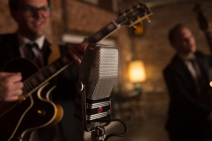 One active A440 microphone captures the piano and vocal simultaneously, while another captures the upright bass. The guitar is recorded by an R44CX. The resulting sound brilliantly demonstrates the expansive sonic range of the AEA R44 series microphones. The mics all run through TRP2 preamps.